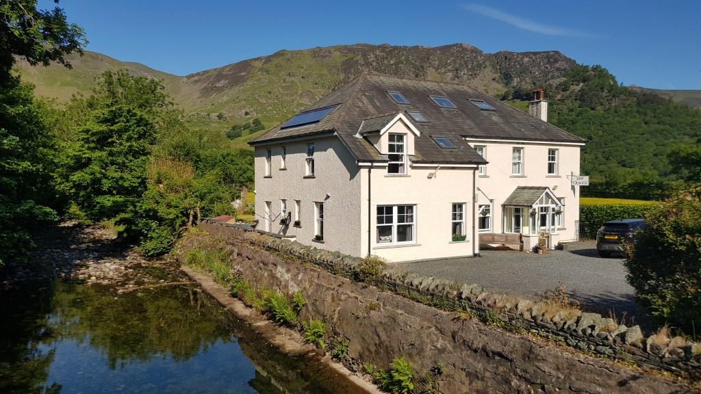We arrived in Grasmere just in time for the FA Cup Final at the local pub. Football was the winner on the day. Manchester won. Our accommodation at How Foot Lodge was eclectic with a weird and wonderful mix of design styles, strange layout of rooms (Ad and Barbie’s room had a shower in the end of a hallway – Val and Peter’s room a delightful little sunroom looking over the garden where we are sitting, writing this blog as the sun sets behind a peak we are likely to have to climb to get out of this valley. A dinner of fish (and chip) from Fleetwood in the beer garden of the local pub – Tweedie’s Bar and Lodge. By 7.46, at the time of writing this blog, we are all beginning to flag and bed is not far off. Rest day tomorrow!