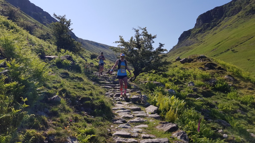 Today’s walk took us from Rosthswaite over Eagle Crag and Lining Crag to Grasmere. We walked along an uneven path alongside Stonethswaite Beck past patchwork fields edged with dry stone walls. Truly Wordsworth country today. A steady climb to Eagle Crag on a rock-strewn track was punctuated by frequent fell runners coming the other way. They were running a 23mile race up and down Scafell Pike (the Everest of Cumbria, England’s highest summit at 978m) and two other peaks.