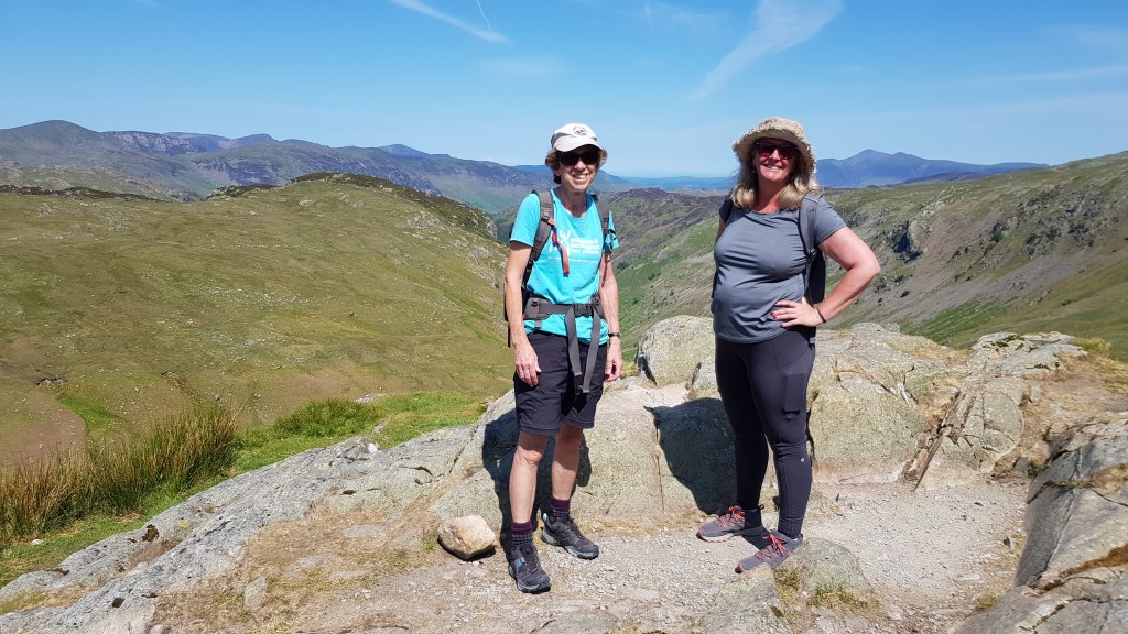 The second phase of the climb, up to Lining Crag was not Barbie’s favorite part of the day – almost a scramble rather than a walk – hands required at times. We stopped at the top to enjoy the view and could still see a glimpse of the sea where we started and a wind farm off the coast. We reached Greenup Edge pass at 600m around lunch time and stopped for a bite to eat.
