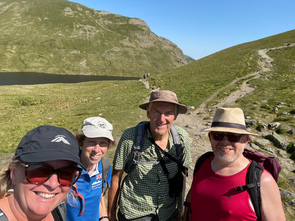 Today’s walk was from Grasmere to Patterdale over Grisedale Hause (narrow passage between hills). We left our quirky accommodation early with ham and cheese croissants wrapped in napkins for our lunch in an attempt to get our walk underway before the heat of the day. We walked past St Oswald’s churchyard where Wordsworth is buried (no daffodils, but the rhodedendrons are amazing here). The track up to the hause began gradually (see photo above), but as we neared the summit, got very steep indeed and quite busy. We encountered Stick Men (four English men all equipped with walking poles), the cast from Gilligan’s island (an American crew of 6 with one hapless husband who seemed to be the butt of all the jokes) and Crocodile Dundee across the day. At the top of the 600m climb was Grisedale Tarn, a mountain lake and the legendary resting place of the crown of the kingdom of Cumbria (945 AD).