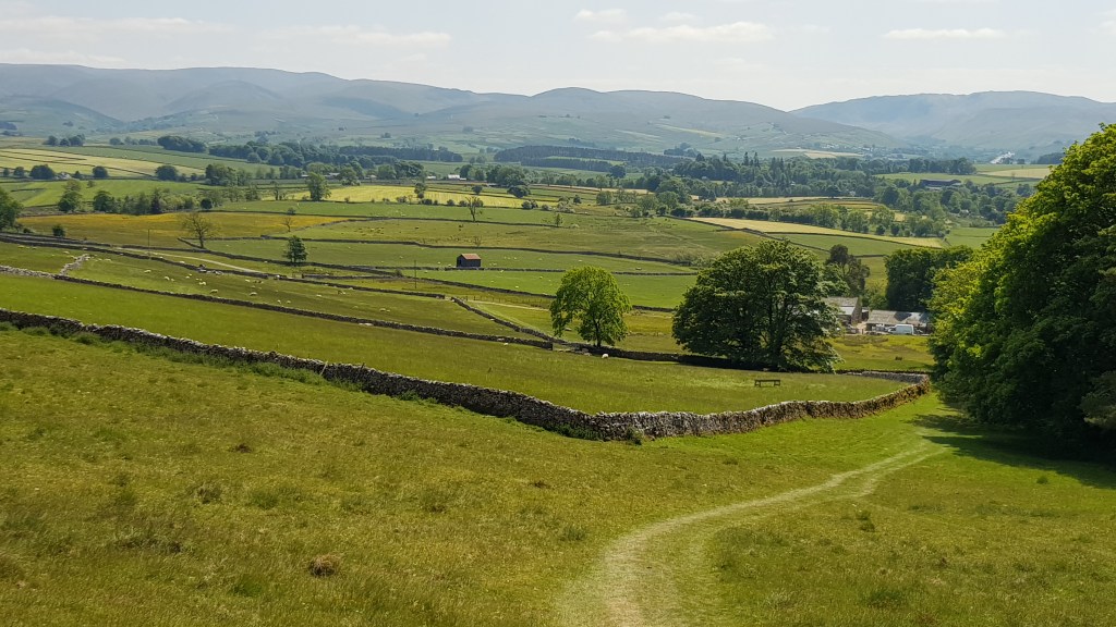 Today’s route took us over the major west coast railway line, a quarry and the M6 motorway – quite a contrast to the peace and remoteness of the previous day. However, we soon were walking through the pastoral landscape of the Yorkshire Dales National Park. A mix of moorland and farmland – sheep, cows, horses, skylarks (but still no red squirrels, badgers or deer as promised in the brochure). The fields were filled with buttercups, cow parsley and other wildflowers, making it a very pleasant walk.