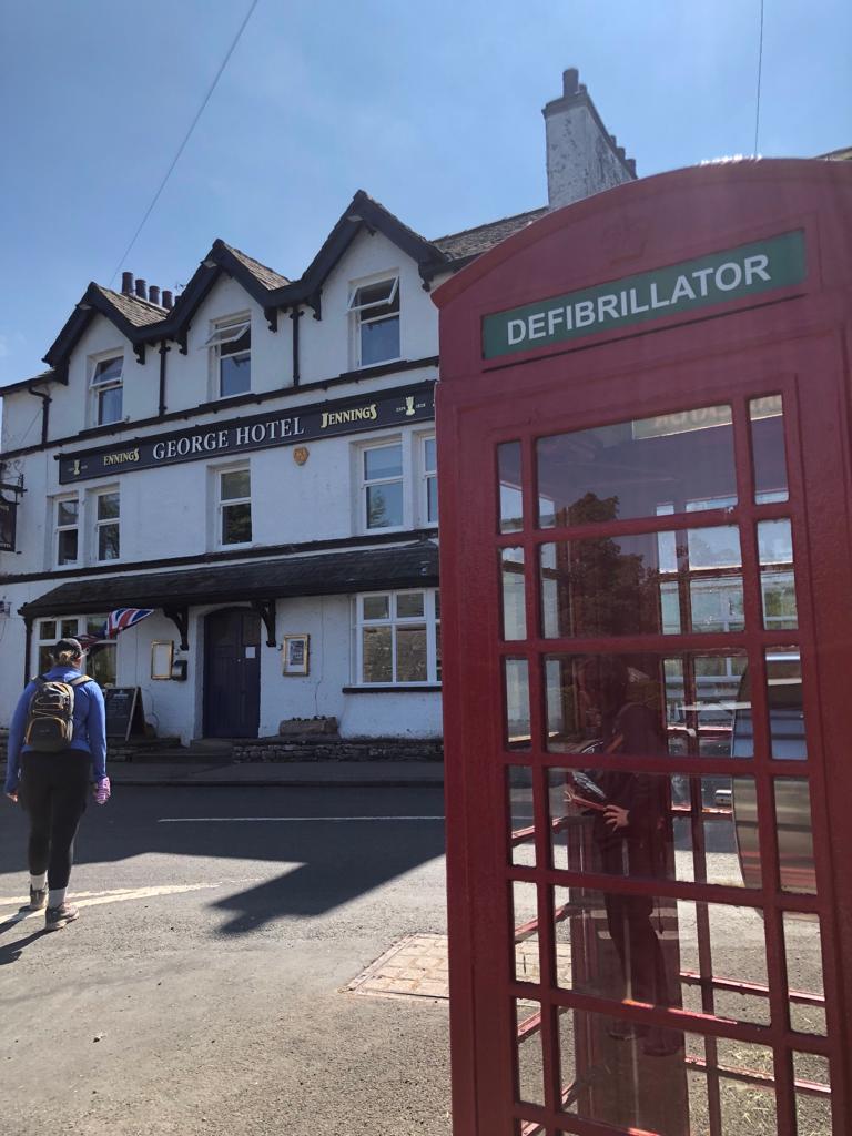 Our accommodation this evening is the George Hotel – basic, but serviceable with perhaps the smallest bathroom in Christendom. Pies (mostly) all around for dinner. And a defibrillator outside!