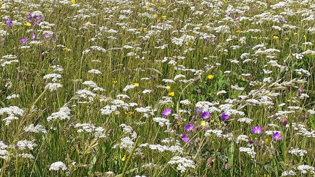 With blue skies above – a change from the recent cloudy mornings – and a wide path along the river, we set off initially through woodland. Towards Muker we turned off the path to see the flower-filled hay meadows, and they were just as beautiful as we’d been promised – red clover and yellow buttercups and meadow cranesbill and yarrow (we think!).