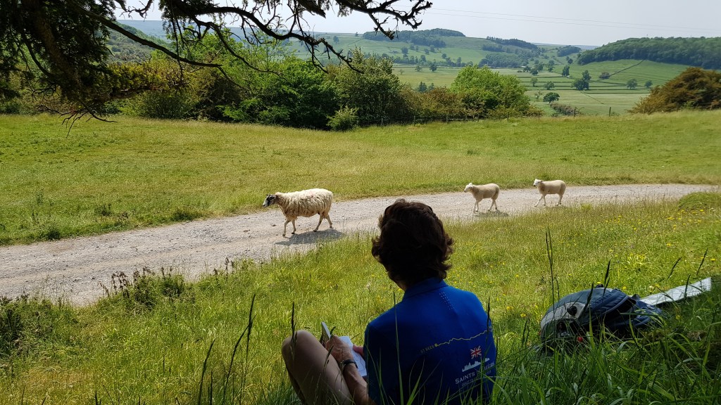 Past the Marrick Priory (a Benedictine nunnery from 1140), through a path through the woods of 365 steps placed by the nuns as penance (one for each day of the year), and into farmland. Fortunately, Elaine’s Farmhouse was only 8 km down the road, for a sustaining scone and tea cake. We walked past a number of small villages with exuberantly flowering cottage gardens, across many a field of grass, cow parsley and buttercups. The River Swale was a constant companion, sometimes close by, sometimes at a distance (We found ourselves Swale-watching today).