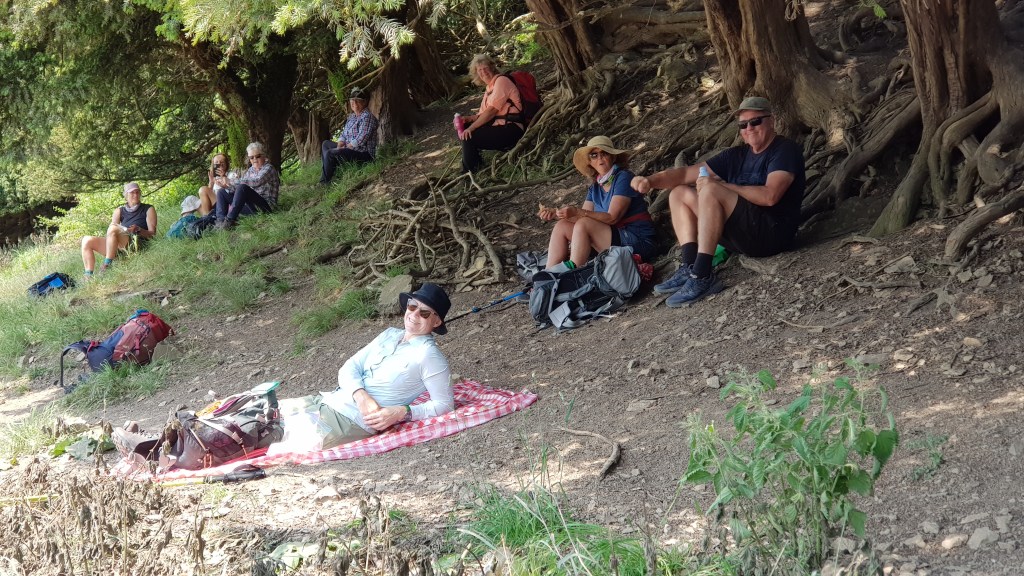 One of the highlights of the Coast to Coast are the people you meet along the way. We have already introduced you to some of our fellow C2C travelers – the Stick Men, Ronnie Corbet and Later feat. Cap’n Decibel and the latest additions, the Peloton; an organized group of ten hikers from NZ and Australia. We got to know the Peloton a little better today as, coincidently, both groups took a detour to have morning tea at Elaine’s Farmhouse Kitchen and shared stories from the walk in amongst the tea and scones. It turns out we have been annoying the Peloton on a regular basis as we get on the trail early and claim the best spots for a morning break and lunch. Every time they pass us we are sprawled out in the sunshine resting our feet before the assault on the next peak. Thus, they have named us, the Happy Nappers – a title we are pleased to accept. We have been swapping photos with the Peloton for several days now and look forward to further early claims on preferred rest stops.