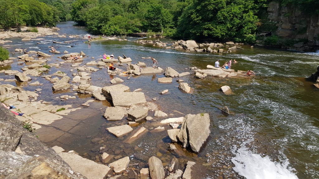 We then headed down to the waterfalls just below the Castle, not expecting a lot because of the current very low water levels in the River Swale, but were pleasantly surprised when we got there. Dozens of people were already in the water at the falls, and up and down stream, making the most of the cool water on a hot day.