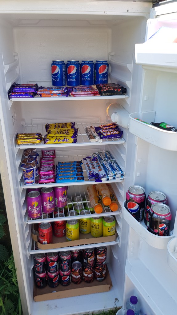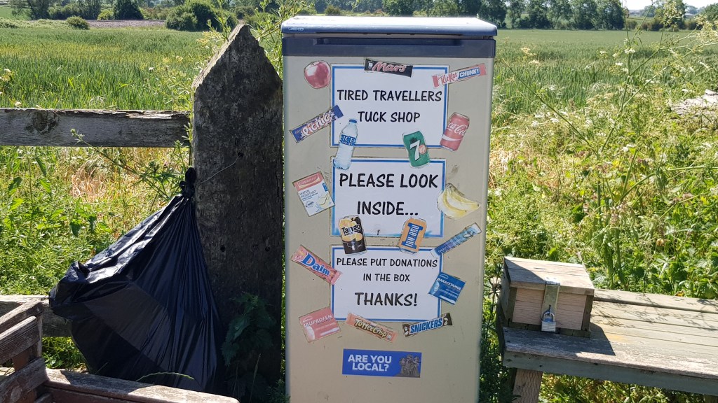 Today’s walk was, in many ways, similar to yesterday’s, but with fewer fields and more gravel roads. Barley continues to be the crop of choice, and proved to be hay-fever inducing. We were able to tick off another of the big five with two separate hare sightings. Along the way we encountered one of the many honesty-based tuck shops we have found on the route. This one was an extremely well-stocked, rather large fridge in the middle of nowhere offering drinks, chocolate bars, blister plasters and paracetamol. We only had a ten pound note, so were obliged to take a break and feast.