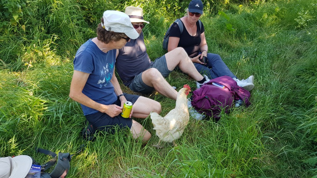 Val has the attribute, of many in animal facing professions, of attracting wildlife wherever she goes – the farm cats at Lovesome Hill, biting insects, but also today chickens. Let us introduce you to Gregory (Peck) and David (Peckham) who joined us for our morning tea.