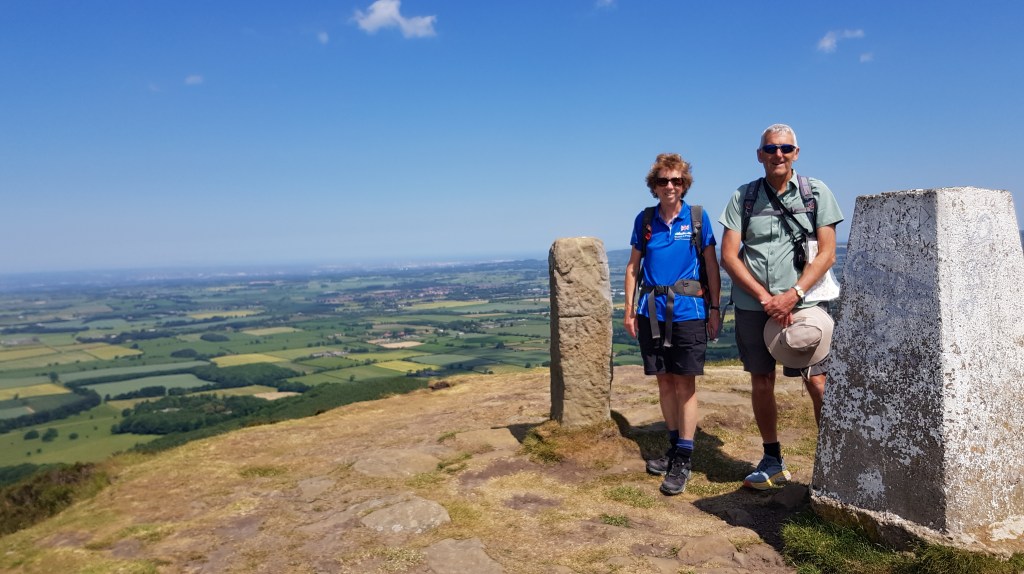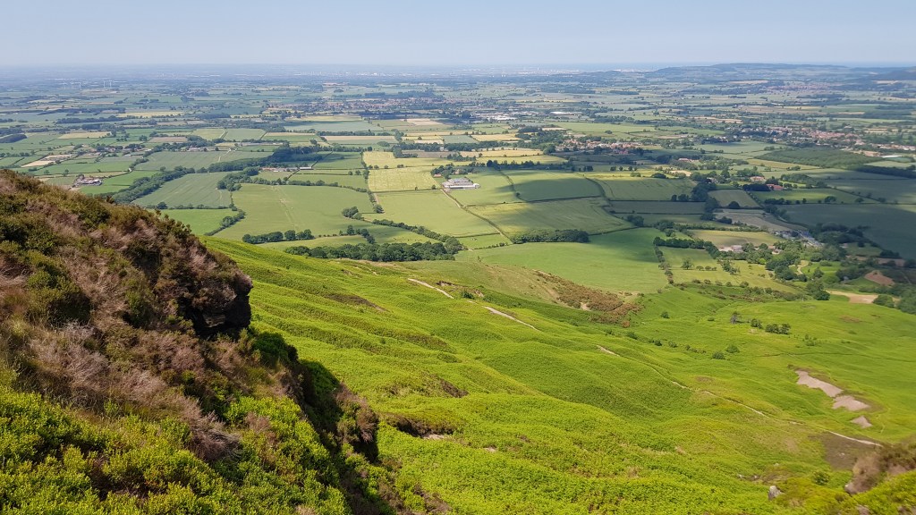 The path continued through some woodland and up onto the Cleveland Hills which are part of the North York Moors – our old friends the heather clad hills accompanied us for much of the day. In previous days we have had moorland on both sides of the path, but today we had the reddy-brown heath clad moors to our right and an increasingly open vista of green farmland stretching away to our left. A huge contrast.